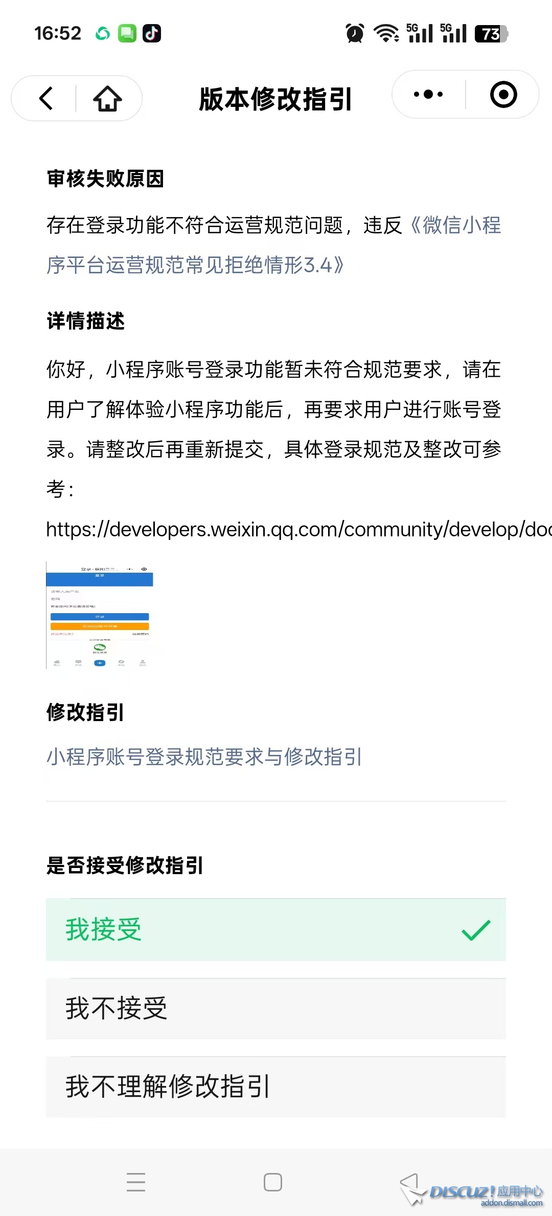 各位大佬,我今日發布了網站小程序代碼(使用的是官方的Discuz! X3.5+ 手機版微信小程序包),提交后在審核時被駁回了,提示:“存在登錄功能不符合運營規范問題,違反《微信小程序平臺運營規范常見拒絕情形3.4》”,如下圖所示: