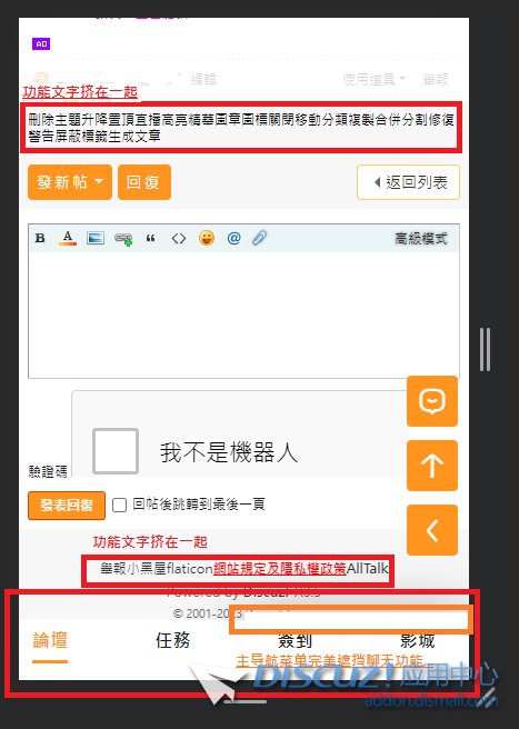 (1) 主導航菜單能改到上方么? 主導航菜單完美的遮擋到我的聊天功能了... (2) 功能文字全部都擠在一起了... 能在中間加上【|】分隔 另一個極簡藍自適應模板 建議也能在主導航下方增加位置資訊 @qzuser1212 ... 查看全文