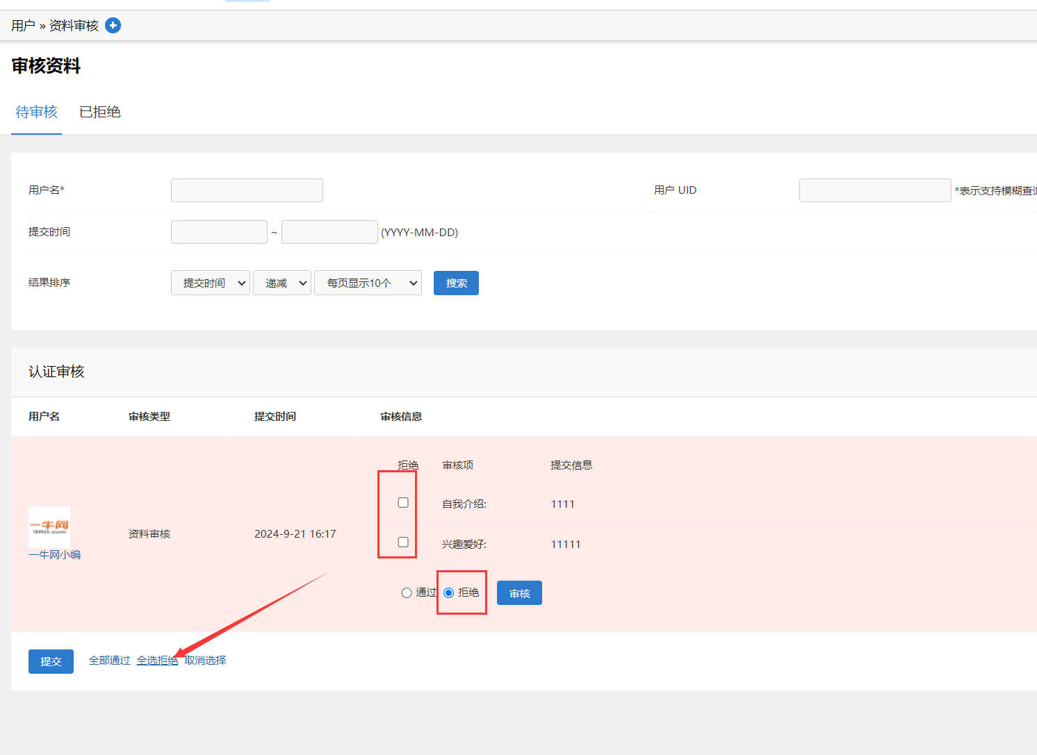 [已關(guān)閉] 后臺審核資料,點擊全部拒絕沒有彈出填寫拒絕理由的框 |